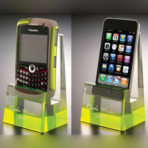 This Lucite award features a colored bottom and is designed to hold your phone - creating a token of appreciation that is both stylish and functional! Measuring 3" x 4 3/4" x 2 1/2", it's an excellent desk accent.