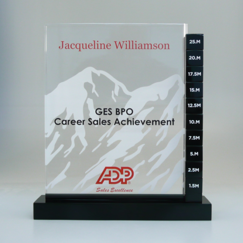 This award allows you to add years of service to the side of the award. not only did this creation win the 2018 NJ AD Club Award 2nd Place Advertising Specialties Category ADP Sales Award; but also, was added to the collection as a new item!