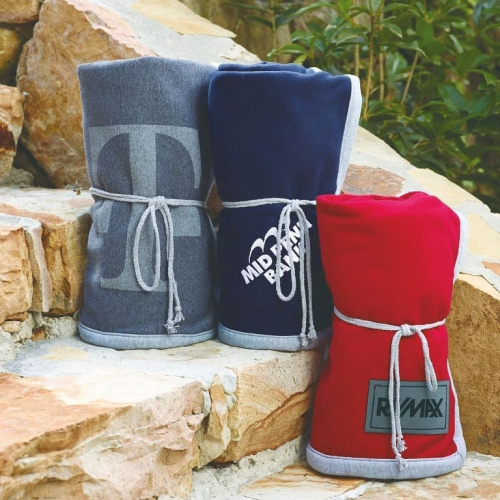 Name a place or a season and there's a use for the Highlander Four Seasons Blanket. At 50" x 70", this generously sized fleece blanket is perfect in cold weather as a lap blanket or in warmer climes as a sofa throw or picnic blanket. Full size or corner Tone on Tone logos look fantastic on the Highlander. Also available with embroidery or laser patch. Available in charcoal, navy and red, each with a grey border to frame your logo. Blankets are rolled and tied with matching grey rope.