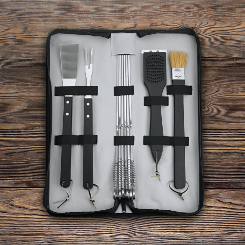 Have all the necessary BBQ tools for the next big game. Eleven-piece BBQ set includes spatula, brush, fork, and cleaning brush (all with wooden handles), six skewers, and zippered carrying case.