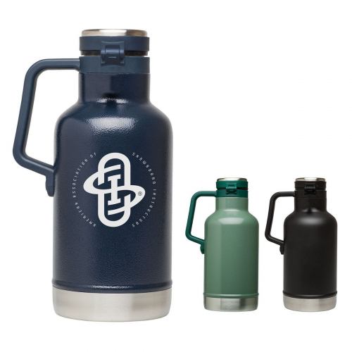 Tame your thirst for a cold and frosty brew with this massive 64-ounce Stanley classic-styled vacuum growler. This 6.5" x 4.9" x 11.6" 18/8 stainless steel container sports "Little Brown Jug" looks with the iconic handle. The wide mouth makes filling, drinking and cleaning a breeze. Beer stays carbonated and delicious in this tanker, with an audible 'pop' each time its opened. The insulated construction keeps beer cold for 24 hours. Add your corporate logo to create a valued promotion that's sure to please any beer fan - or those who love a frosty container of whatever their favorite beverage might be!